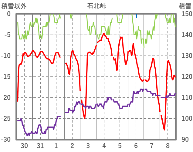 | 日 | 時 | 気温 | 降水 | 風向/風速 | 日照 | 積雪 | 降雪 |