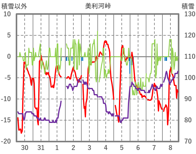 | 日 | 時 | 気温 | 降水 | 風向/風速 | 日照 | 積雪 | 降雪 |