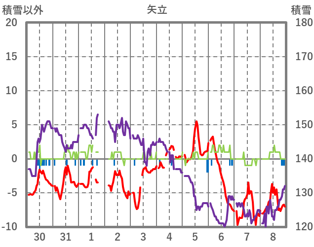 | 日 | 時 | 気温 | 降水 | 風向/風速 | 日照 | 積雪 | 降雪 |