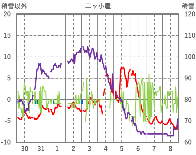 | 日 | 時 | 気温 | 降水 | 風向/風速 | 日照 | 積雪 | 降雪 |