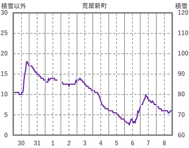 | 日 | 時 | 気温 | 降水 | 風向/風速 | 日照 | 積雪 | 降雪 |