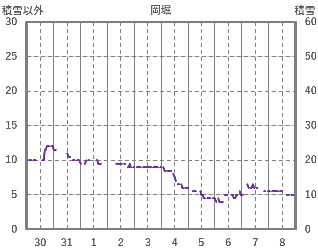 | 日 | 時 | 気温 | 降水 | 風向/風速 | 日照 | 積雪 | 降雪 |
