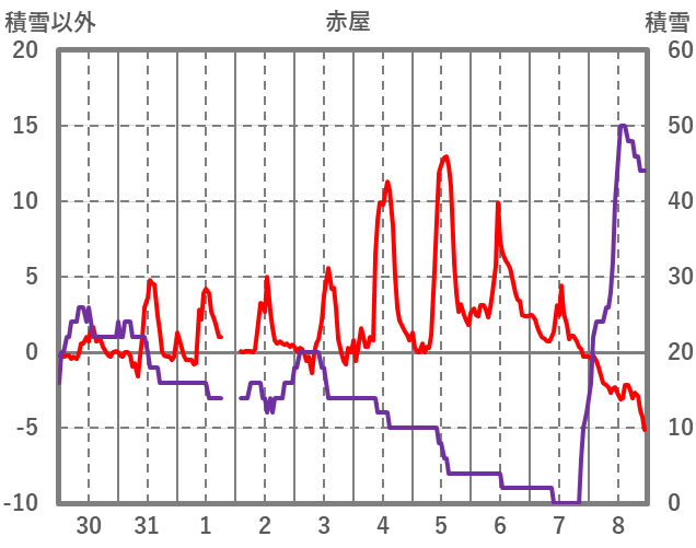 | 日 | 時 | 気温 | 降水 | 風向/風速 | 日照 | 積雪 | 降雪 |