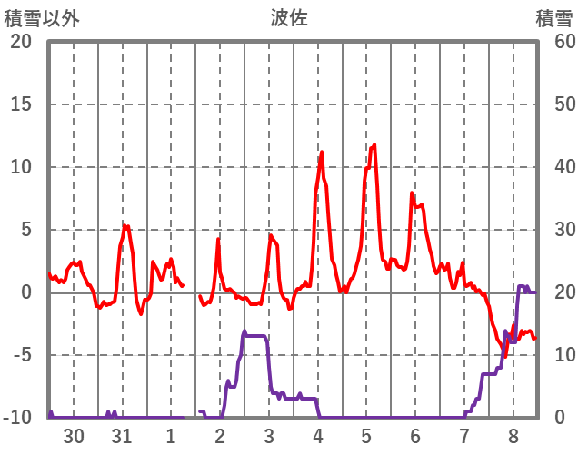 | 日 | 時 | 気温 | 降水 | 風向/風速 | 日照 | 積雪 | 降雪 |