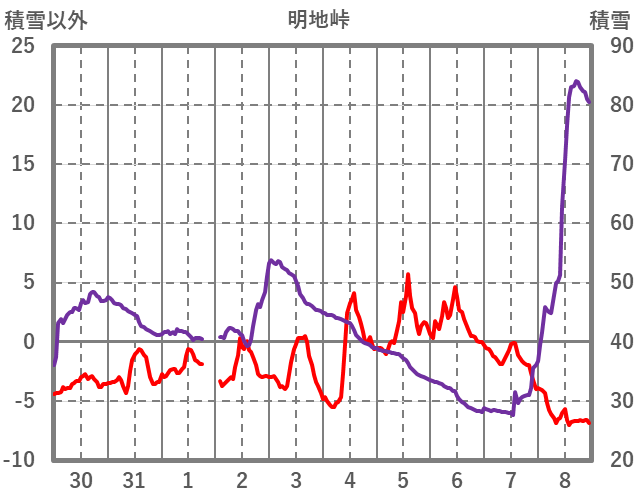 | 日 | 時 | 気温 | 降水 | 風向/風速 | 日照 | 積雪 | 降雪 |