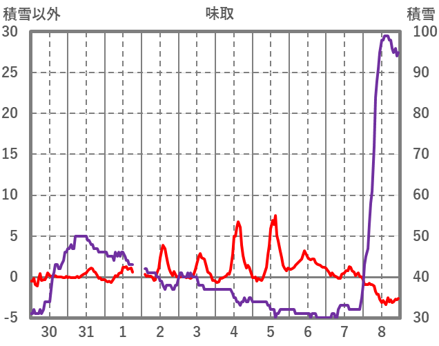 | 日 | 時 | 気温 | 降水 | 風向/風速 | 日照 | 積雪 | 降雪 |
