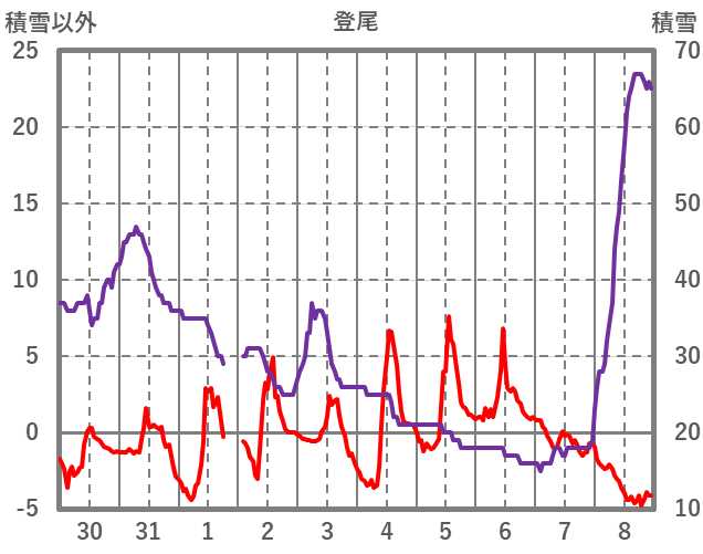 | 日 | 時 | 気温 | 降水 | 風向/風速 | 日照 | 積雪 | 降雪 |
