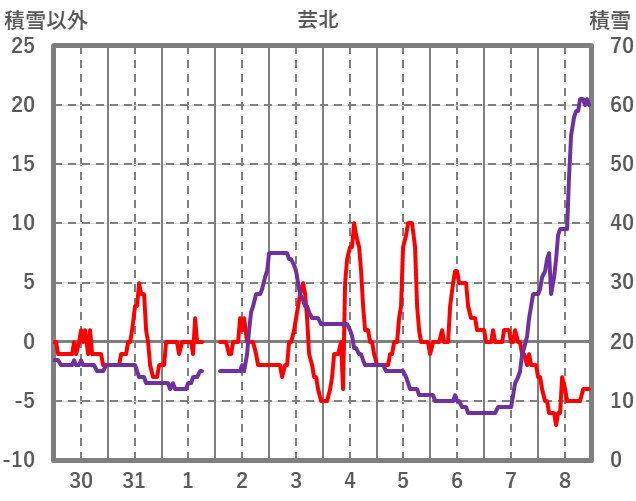 | 日 | 時 | 気温 | 降水 | 風向/風速 | 日照 | 積雪 | 降雪 |