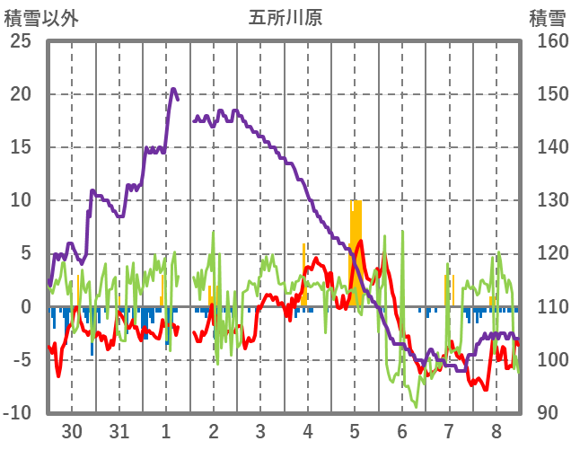 | 日 | 時 | 気温 | 降水 | 風向/風速 | 日照 | 積雪 | 降雪 |