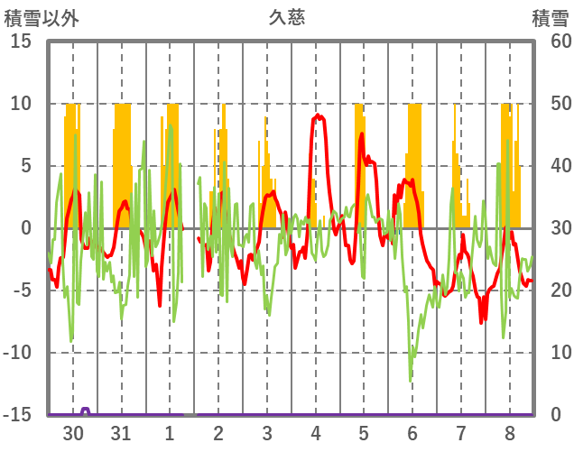 | 日 | 時 | 気温 | 降水 | 風向/風速 | 日照 | 積雪 | 降雪 |