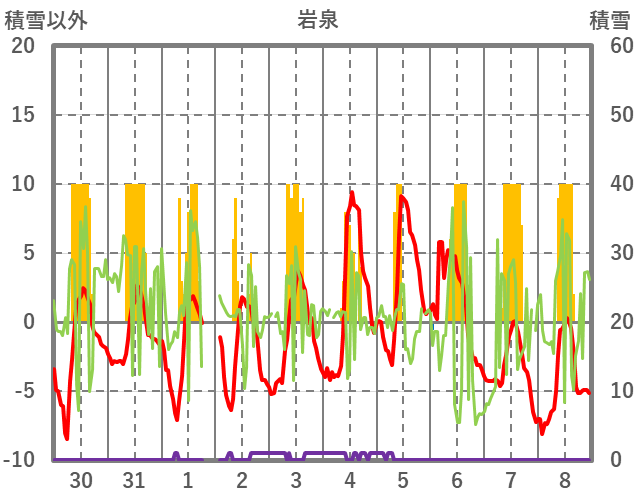 | 日 | 時 | 気温 | 降水 | 風向/風速 | 日照 | 積雪 | 降雪 |