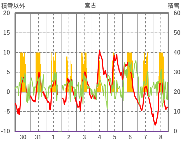 | 日 | 時 | 気温 | 降水 | 風向/風速 | 日照 | 積雪 | 降雪 |