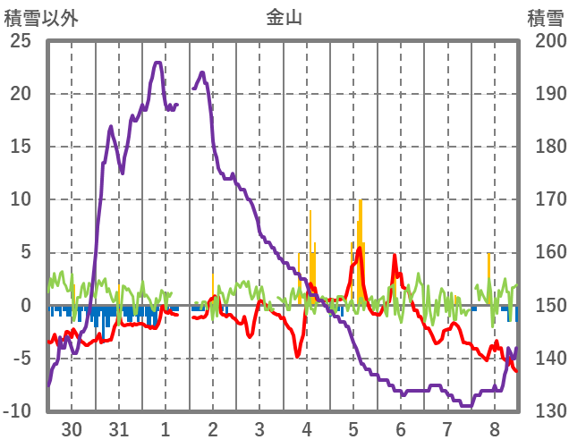 | 日 | 時 | 気温 | 降水 | 風向/風速 | 日照 | 積雪 | 降雪 |