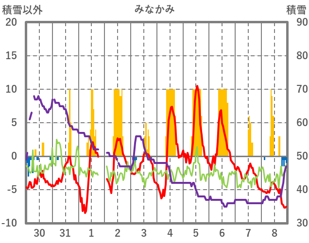 | 日 | 時 | 気温 | 降水 | 風向/風速 | 日照 | 積雪 | 降雪 |