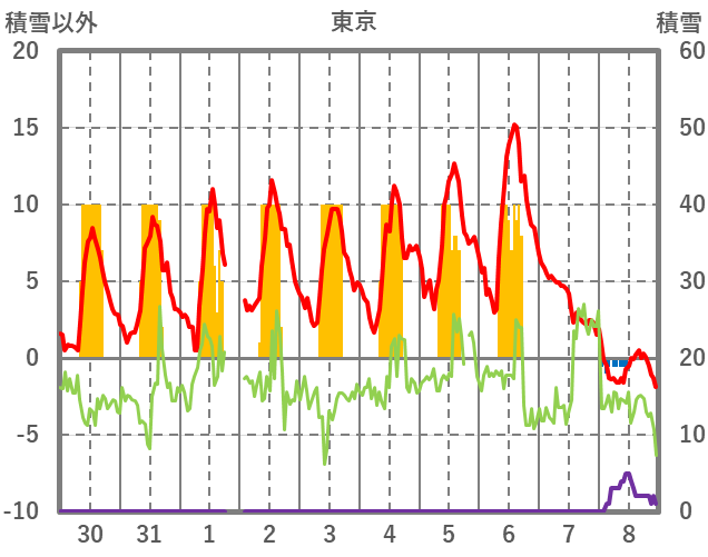 | 日 | 時 | 気温 | 降水 | 風向/風速 | 日照 | 積雪 | 降雪 |