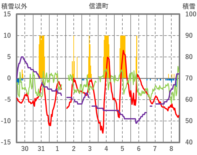| 日 | 時 | 気温 | 降水 | 風向/風速 | 日照 | 積雪 | 降雪 |