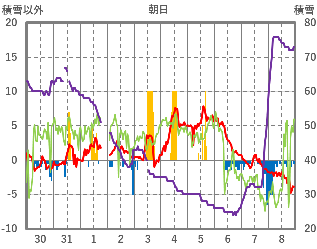 | 日 | 時 | 気温 | 降水 | 風向/風速 | 日照 | 積雪 | 降雪 |