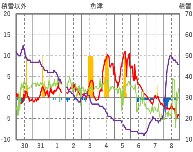 | 日 | 時 | 気温 | 降水 | 風向/風速 | 日照 | 積雪 | 降雪 |