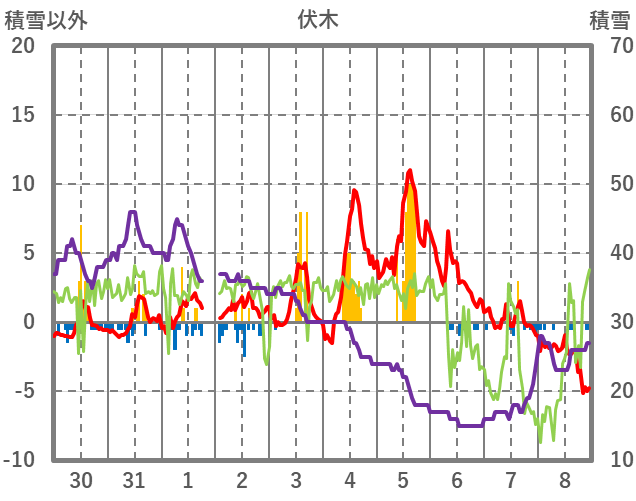 | 日 | 時 | 気温 | 降水 | 風向/風速 | 日照 | 積雪 | 降雪 |