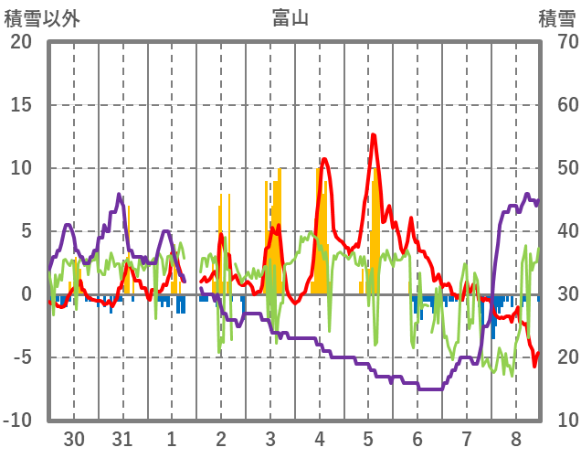 | 日 | 時 | 気温 | 降水 | 風向/風速 | 日照 | 積雪 | 降雪 |