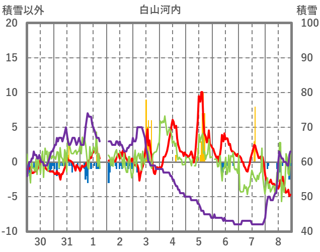 | 日 | 時 | 気温 | 降水 | 風向/風速 | 日照 | 積雪 | 降雪 |