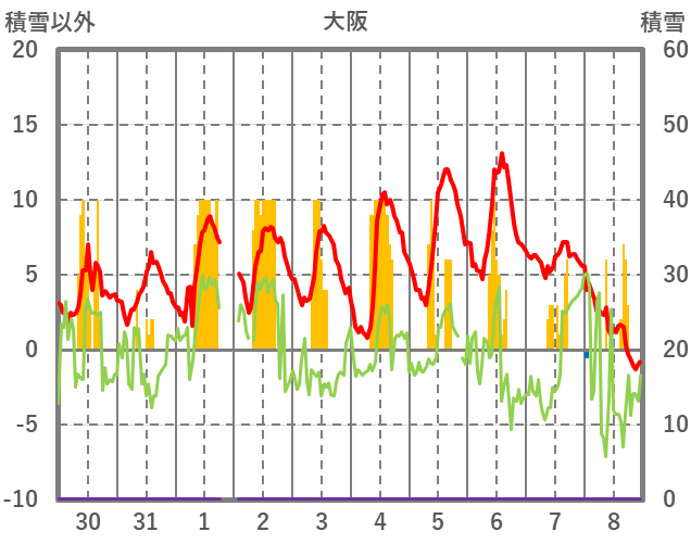 | 日 | 時 | 気温 | 降水 | 風向/風速 | 日照 | 積雪 | 降雪 |