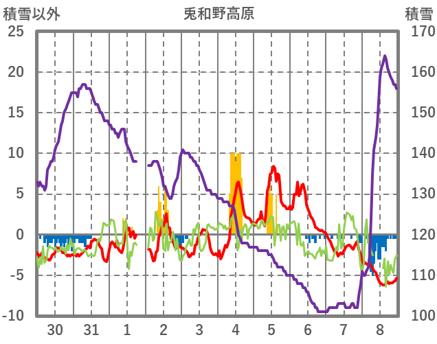 | 日 | 時 | 気温 | 降水 | 風向/風速 | 日照 | 積雪 | 降雪 |