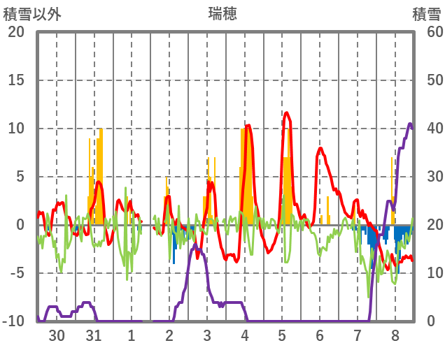 | 日 | 時 | 気温 | 降水 | 風向/風速 | 日照 | 積雪 | 降雪 |