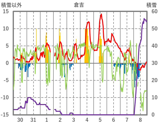 | 日 | 時 | 気温 | 降水 | 風向/風速 | 日照 | 積雪 | 降雪 |