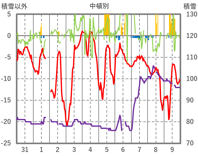 | 日 | 時 | 気温 | 降水 | 風向/風速 | 日照 | 積雪 | 降雪 |
