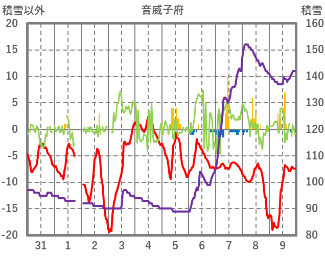 | 日 | 時 | 気温 | 降水 | 風向/風速 | 日照 | 積雪 | 降雪 |