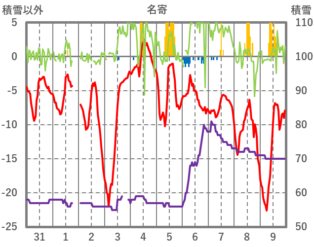 | 日 | 時 | 気温 | 降水 | 風向/風速 | 日照 | 積雪 | 降雪 |