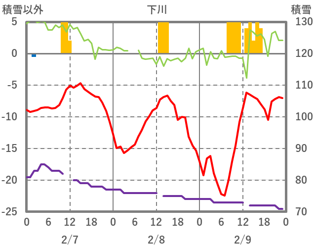 | 日 | 時 | 気温 | 降水 | 風向/風速 | 日照 | 積雪 | 降雪 |