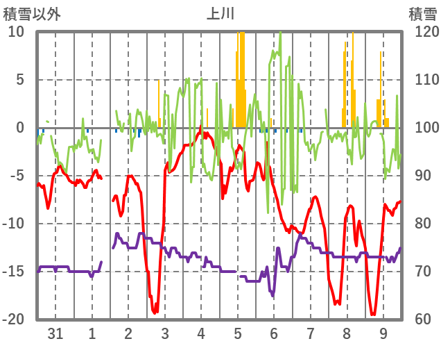 | 日 | 時 | 気温 | 降水 | 風向/風速 | 日照 | 積雪 | 降雪 |
