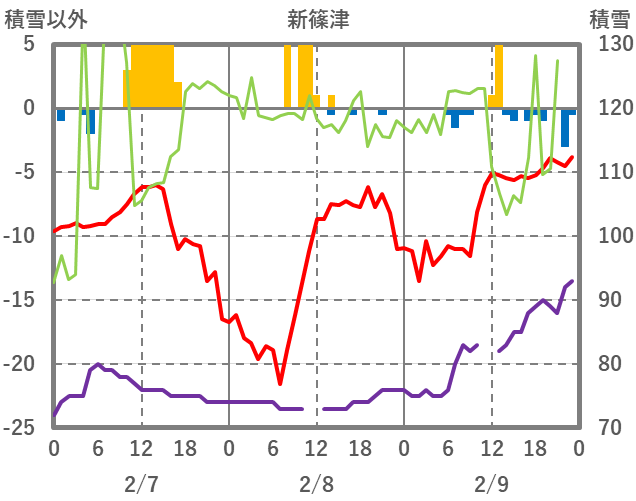 | 日 | 時 | 気温 | 降水 | 風向/風速 | 日照 | 積雪 | 降雪 |