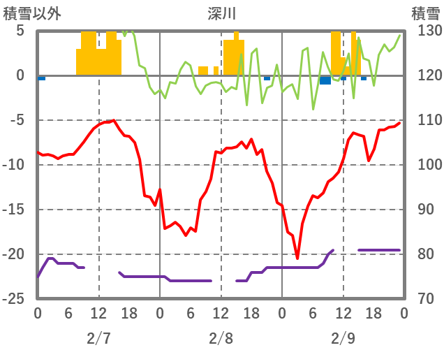 | 日 | 時 | 気温 | 降水 | 風向/風速 | 日照 | 積雪 | 降雪 |