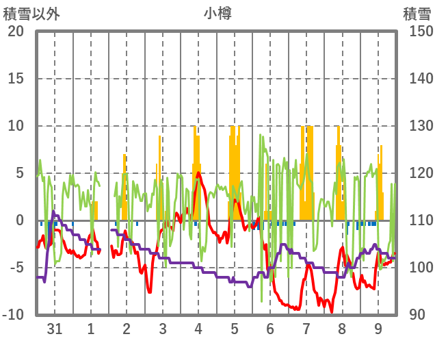 | 日 | 時 | 気温 | 降水 | 風向/風速 | 日照 | 積雪 | 降雪 |