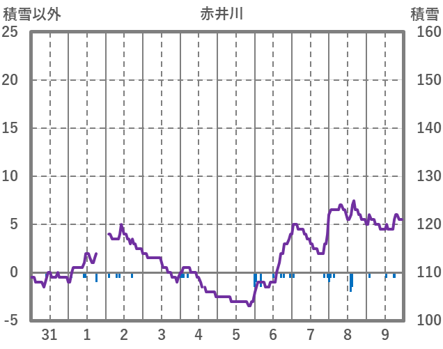 | 日 | 時 | 気温 | 降水 | 風向/風速 | 日照 | 積雪 | 降雪 |