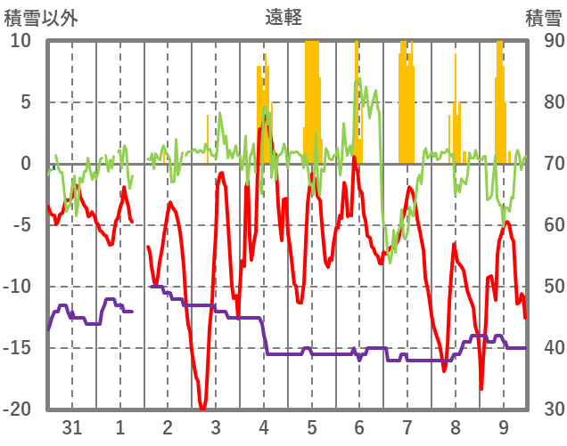 | 日 | 時 | 気温 | 降水 | 風向/風速 | 日照 | 積雪 | 降雪 |