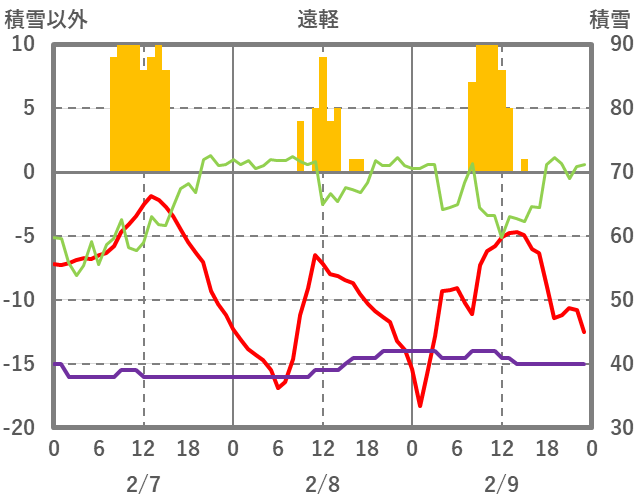 | 日 | 時 | 気温 | 降水 | 風向/風速 | 日照 | 積雪 | 降雪 |