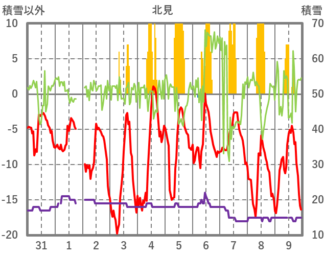 | 日 | 時 | 気温 | 降水 | 風向/風速 | 日照 | 積雪 | 降雪 |