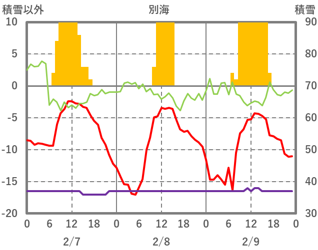 | 日 | 時 | 気温 | 降水 | 風向/風速 | 日照 | 積雪 | 降雪 |