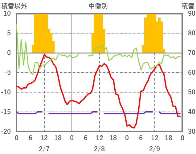 | 日 | 時 | 気温 | 降水 | 風向/風速 | 日照 | 積雪 | 降雪 |