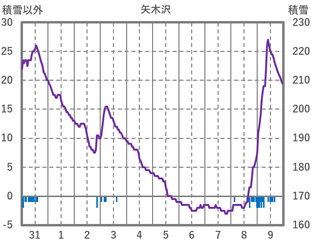 | 日 | 時 | 気温 | 降水 | 風向/風速 | 日照 | 積雪 | 降雪 |