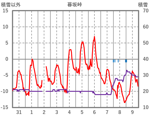 | 日 | 時 | 気温 | 降水 | 風向/風速 | 日照 | 積雪 | 降雪 |
