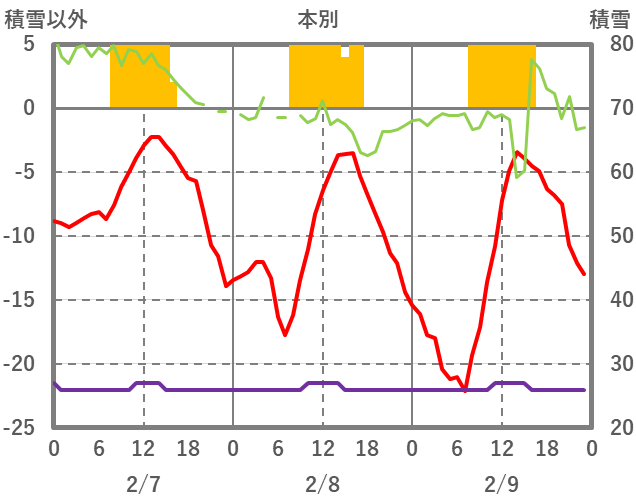 | 日 | 時 | 気温 | 降水 | 風向/風速 | 日照 | 積雪 | 降雪 |