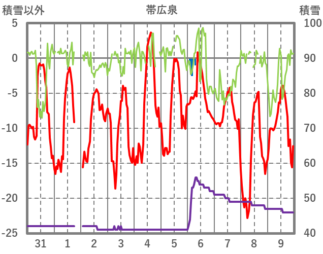 | 日 | 時 | 気温 | 降水 | 風向/風速 | 日照 | 積雪 | 降雪 |
