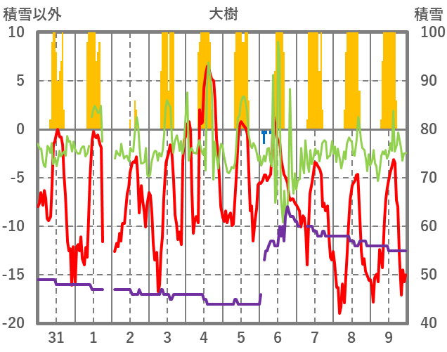 | 日 | 時 | 気温 | 降水 | 風向/風速 | 日照 | 積雪 | 降雪 |