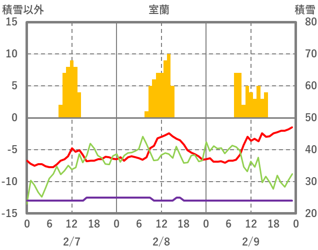 | 日 | 時 | 気温 | 降水 | 風向/風速 | 日照 | 積雪 | 降雪 |