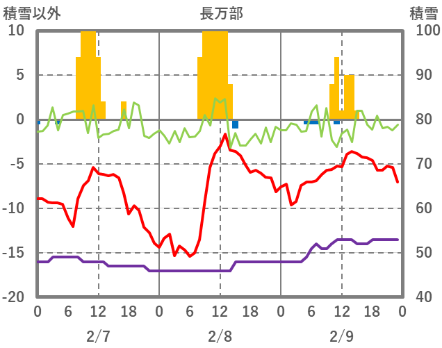 | 日 | 時 | 気温 | 降水 | 風向/風速 | 日照 | 積雪 | 降雪 |